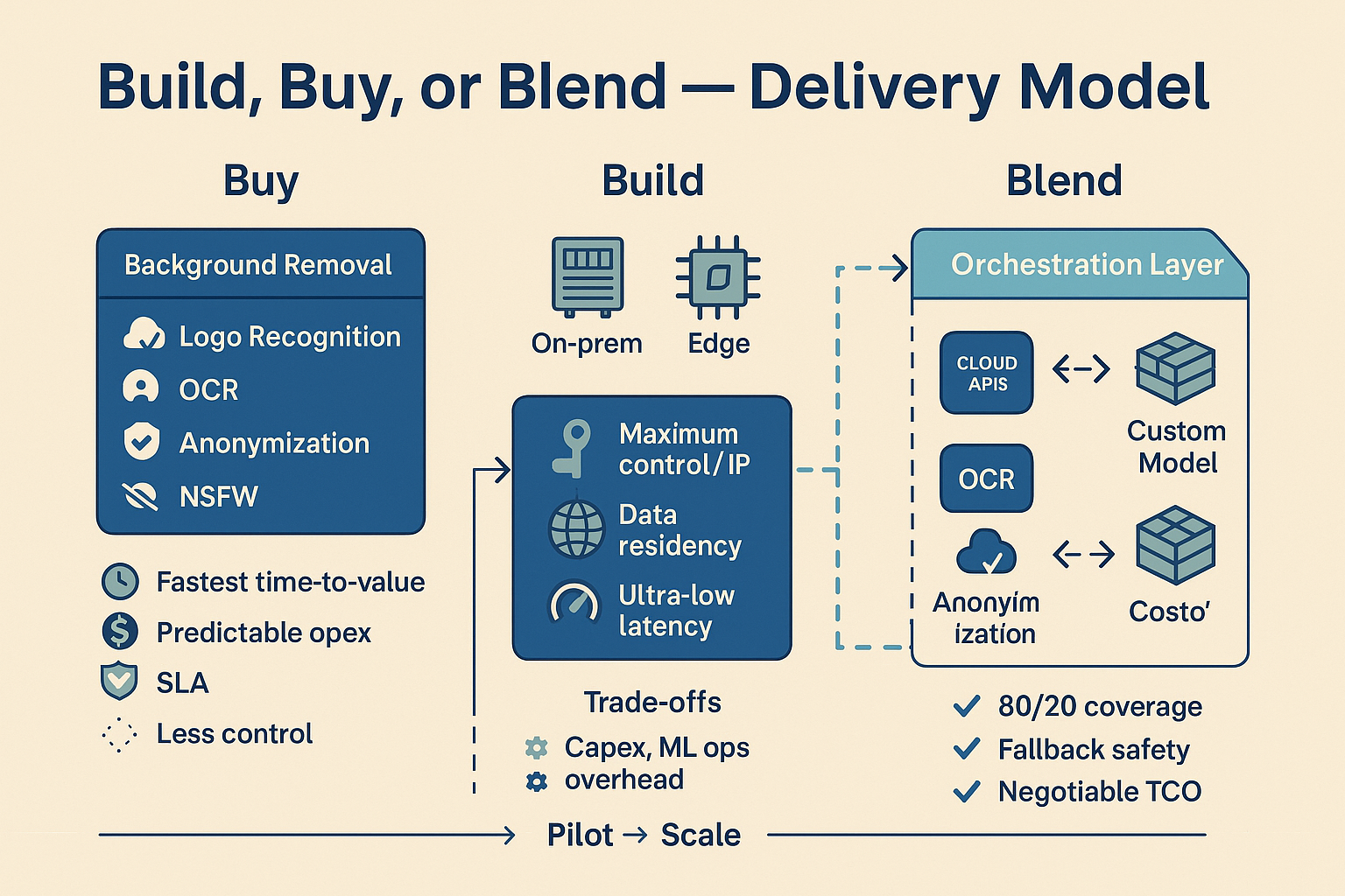 Latency & location: Interactive use or edge constraints increase the case for build/hybrid. Batch publishing favors buy/blend.