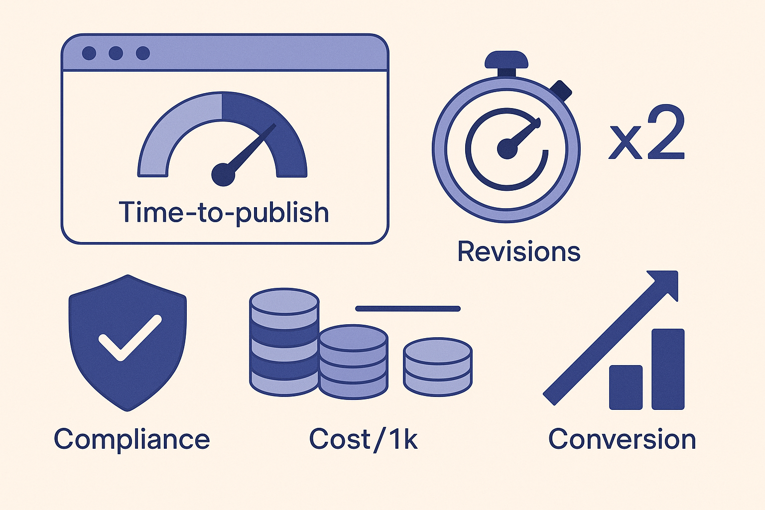 Baseline four numbers for a representative product line: average hours to publish, revisions per asset, cost per 1,000 assets, and conversion on key surfaces.