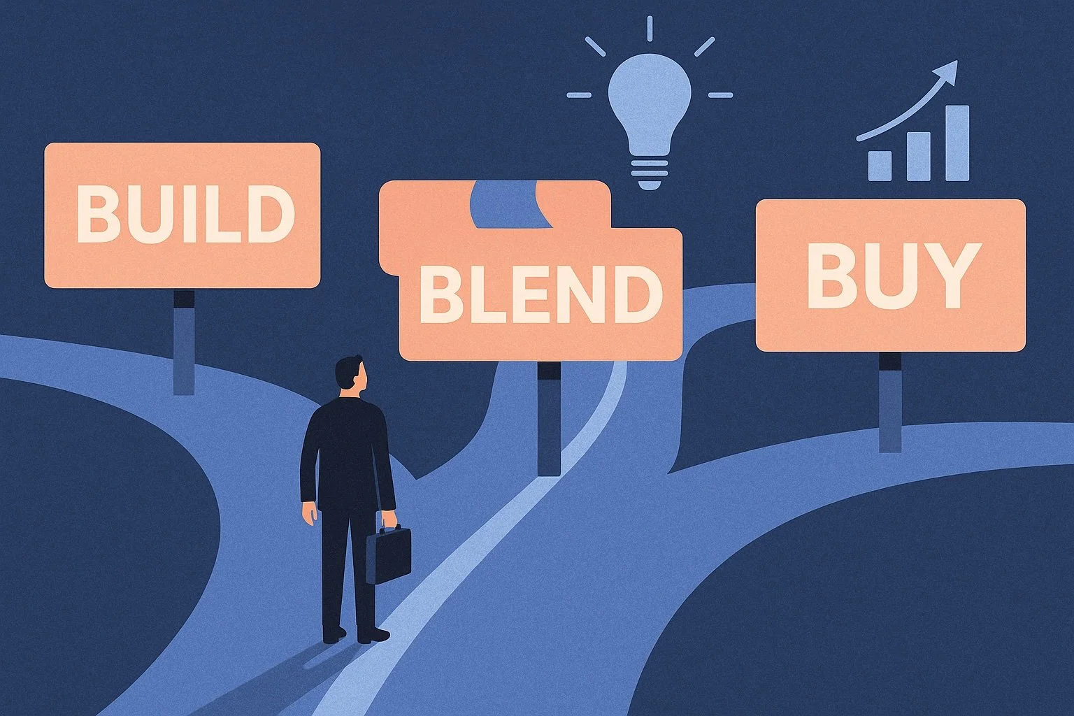 In practice, companies typically follow one of three strategic paths: Build, Buy, or Blend. Each comes with distinct trade-offs in terms of investment, flexibility, and speed to value.